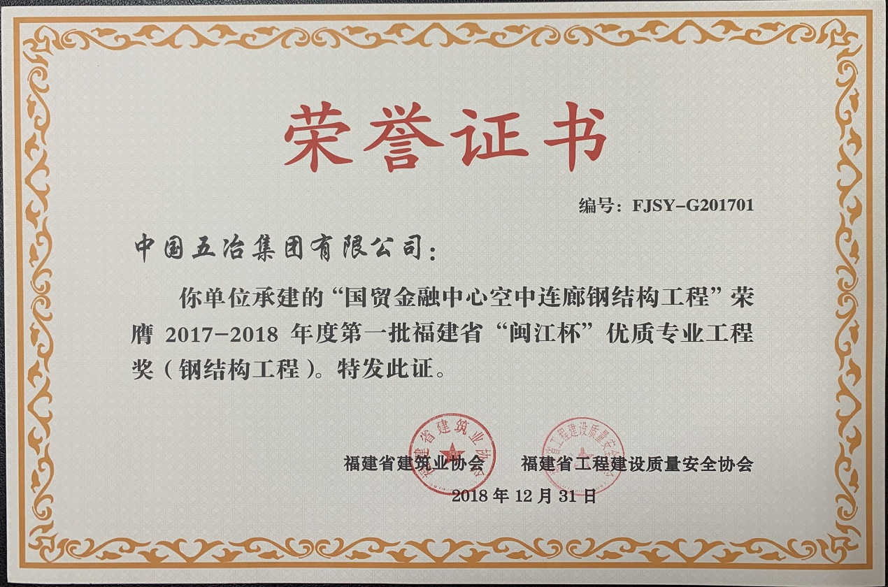 “國貿金融中心空中連廊鋼結構工程”榮獲2017—2018年度第一批福建省“閩江杯”優質專業工程獎(鋼結構工程)