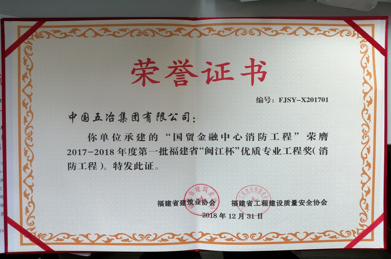 國貿金融中心消防工程榮獲2017—2018年度第一批福建省“閩江杯”優質專業工程獎(消防工程)