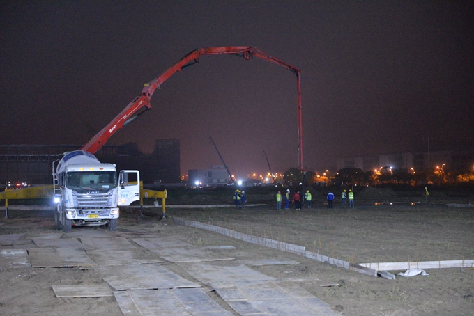 無懼風雨,重任在肩。4月13日晚,臨港大雨,氣溫驟降至13度。突如其來的暴雨再次升級任務難度。直面突發(fā)難題,中國五冶積極協(xié)調各項資源,加大人力、設備投入。通過現(xiàn)場鋪設鋼板,打通設備進場道口,緊急調送泵車,確保混凝土澆筑。集裝箱采取成品外調運送進場,1200個成品集裝箱分批次運赴現(xiàn)場。